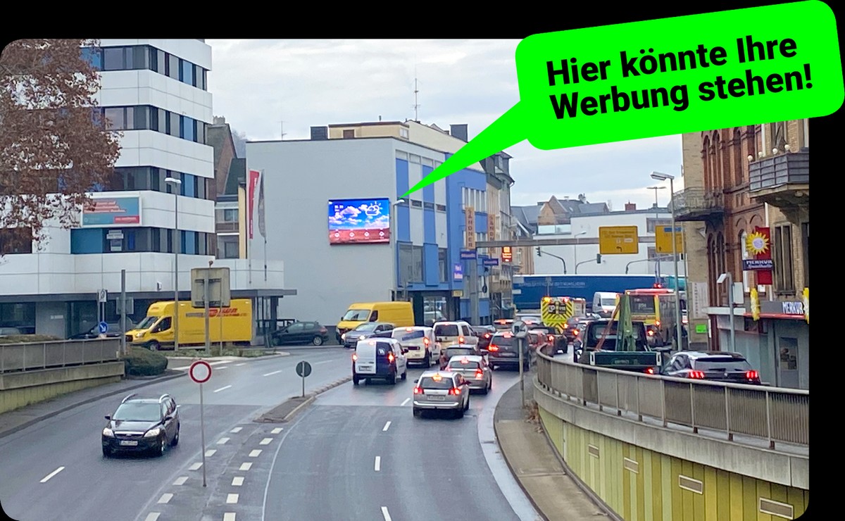 Der Standort der LED-Wand befindet sich an einer der meistbefahrenen Straßen Limburgs, der Schiede. Aus dem Schiedetunnel kommend, passieren Richtung Kreuzung Diezer Straße / Schiede täglich etwa 20.000 Autos unsere Werbewand.