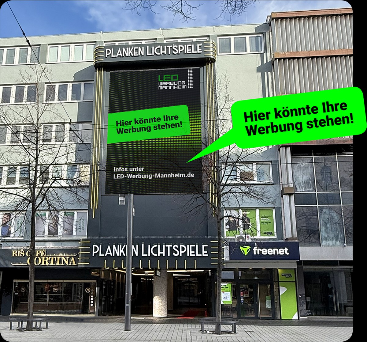 Die neue, über 52 m² große LED-Tafel am Gebäude des gerade eröffneten Kinos Planken Lichtspiele sorgt dank hochauflösender 2K-Darstellung für maximale Aufmerksamkeit. Mit langen Einblendzeiten von 10 Sekunden und der Möglichkeit, Animationen sowie Videos zu zeigen, wird Ihre Botschaft optimal wahrgenommen – ein Standort, der in Deutschland seinesgleichen sucht.