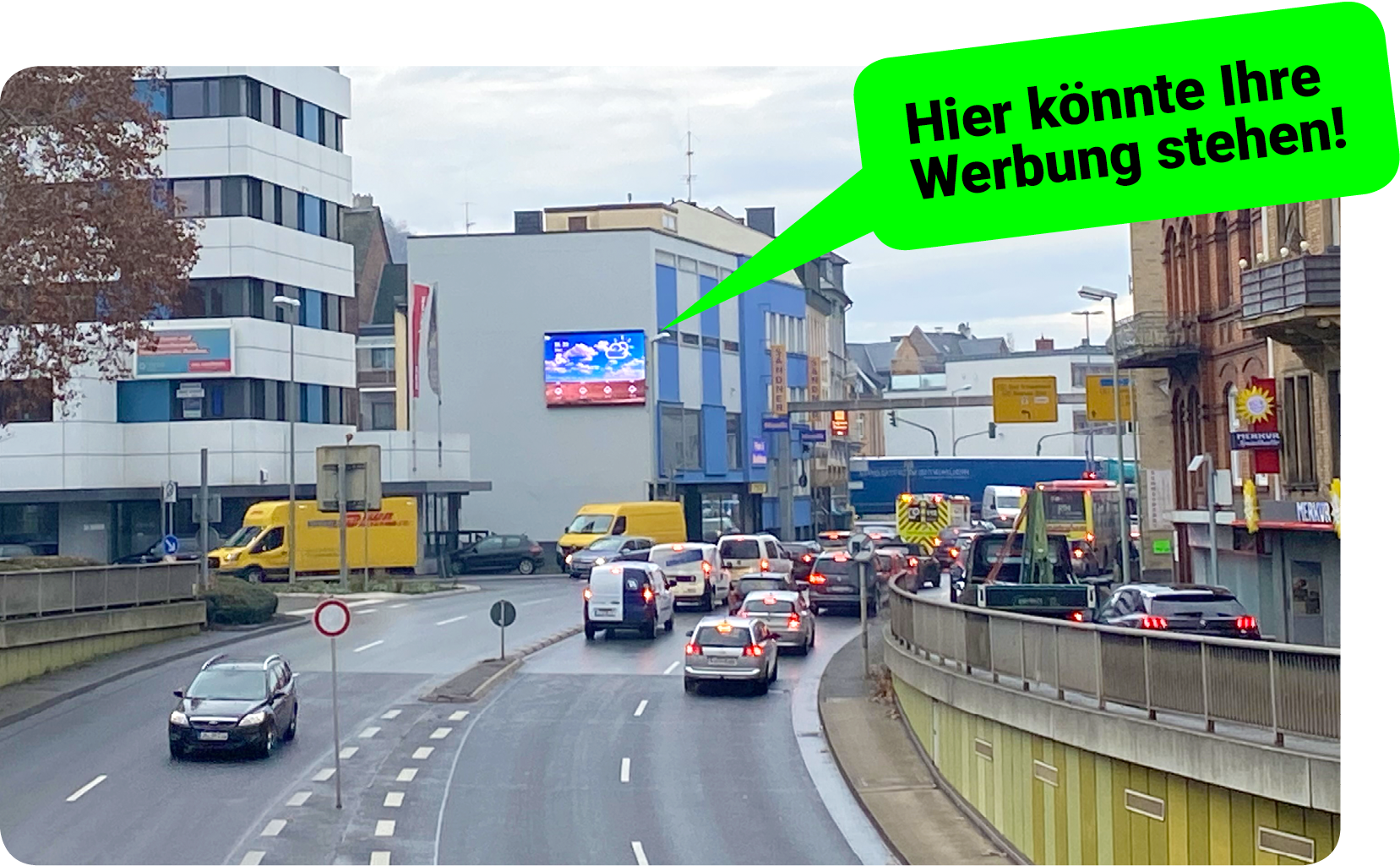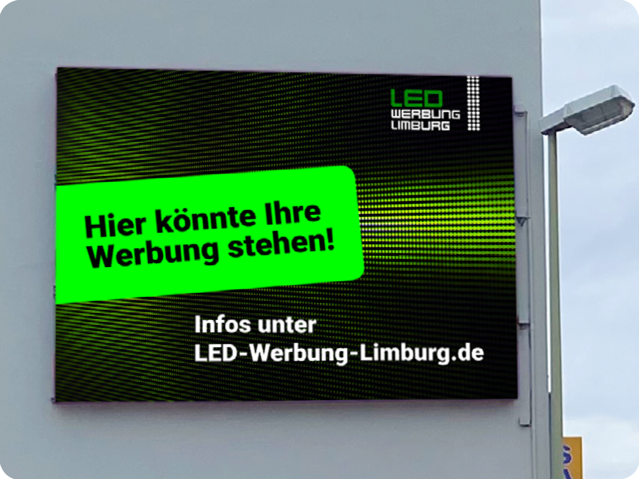 Der Standort der LED-Wand befindet sich an einer der meistbefahrenen Straßen Limburgs, der Schiede. Aus dem Schiedetunnel kommend, passieren Richtung Kreuzung Diezer Straße / Schiede täglich etwa 20.000 Autos unsere Werbewand.